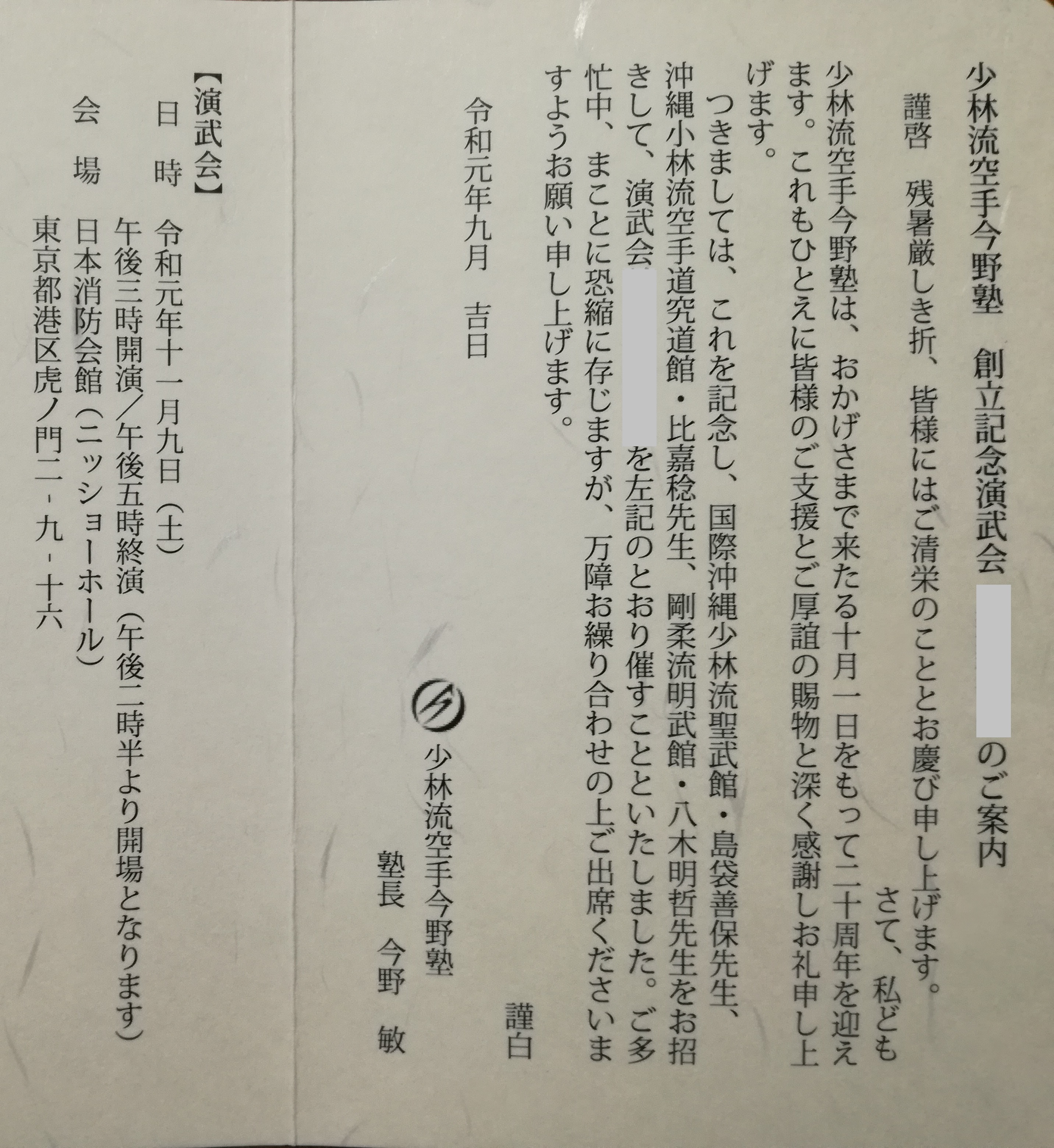 「少林流空手今野塾 創立20周年記念 沖縄空手演武会」のお知らせ